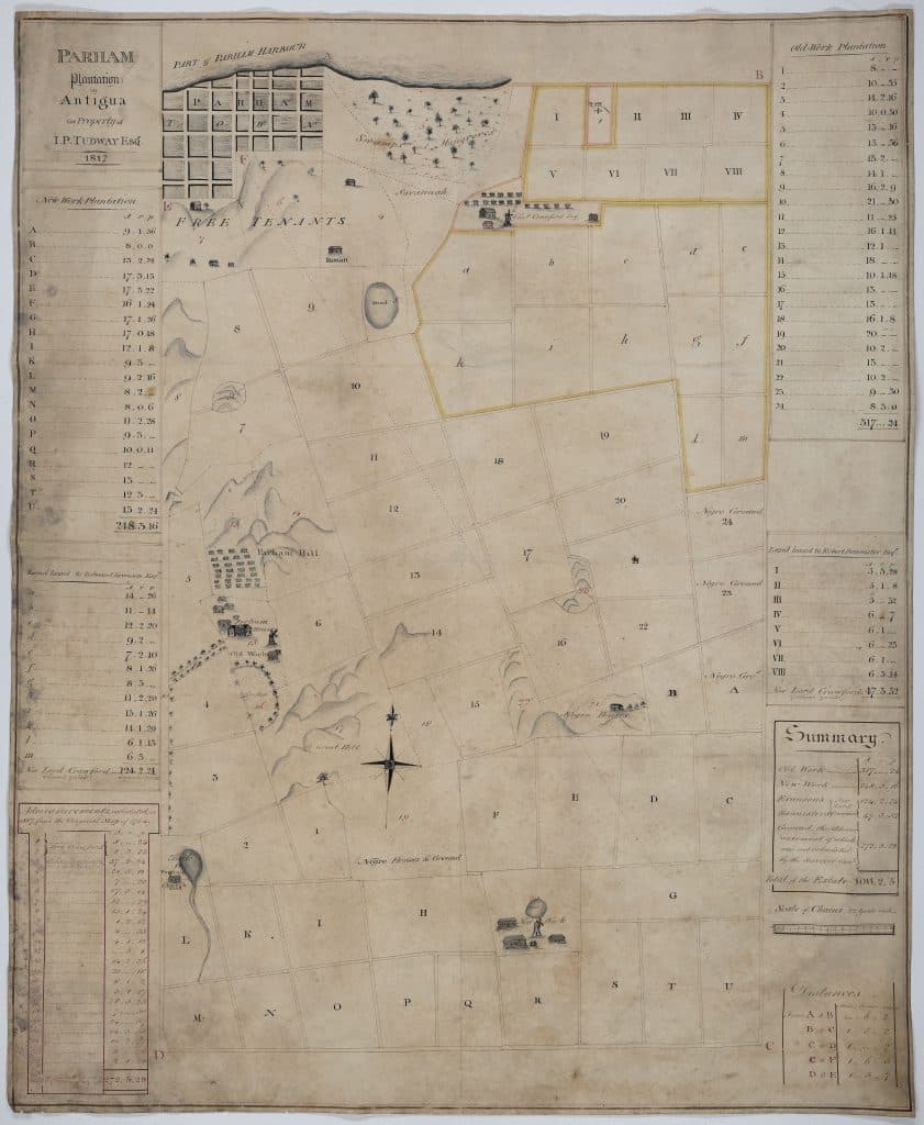The Tudway papers form one of the most complete archival collections on British slavery in Antigua in the seventeenth, eighteenth and nineteenth centuries. With the exception of the Codrington papers, which are held at the National Archives of Antigua and Barbuda, they are virtually unparalleled in the range and depth of material covering this period of history. Within the Tudway collection itself are several rare eighteenth and nineteenth century plantation maps depicting their estates at Parham in the parish of St Peter. There are nine maps in total dating between 1730 and 1819. The earliest map, which dates from 1730, is currently held at the Wells and Mendip Museum, while the rest are held at Somerset Archives (collection number DD/TD/58/6). The Parham maps provide us with precious insights into the lives of enslaved people on the Tudway family’s estates, as well as showing us the evolution of the sugar plantation over a period of almost ninety years. Other archival documents from the Tudway papers, such as correspondence and lists of enslaved people, can help us with the ongoing work of understanding the institution of chattel slavery in Antigua.