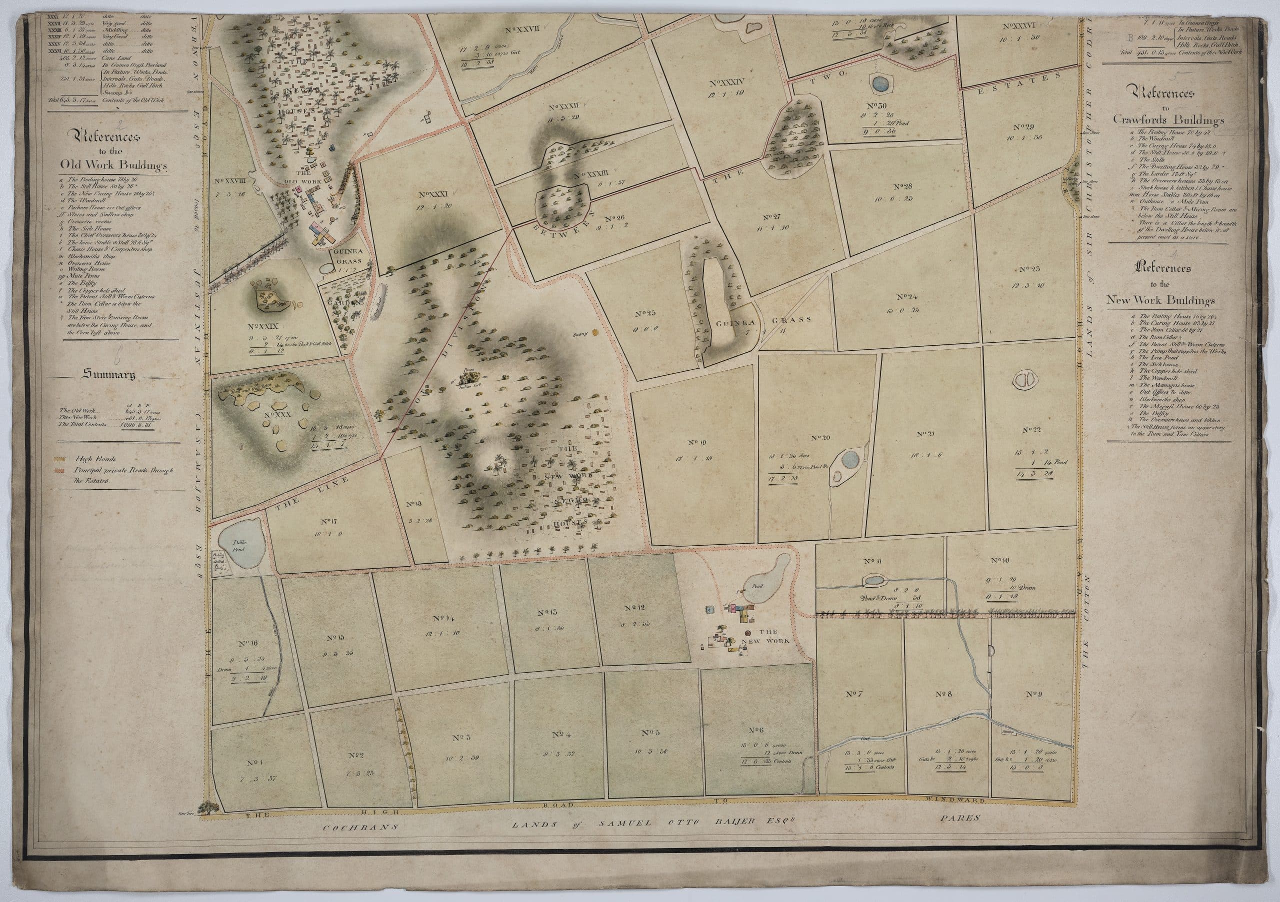 These are two individual maps for the works and buildings on the Parham Old Work and New Work estates in 1817, which were produced separately from the combined survey of Parham. In 1817, there were 322 enslaved people registered on the Old Work estate and 251 registered on the New Work estate according to the triennial returns. The Tudway collection at Somerset also holds a register of enslaved people for the year 1817, which contains additional information such as their state of health and their occupation on the estates.