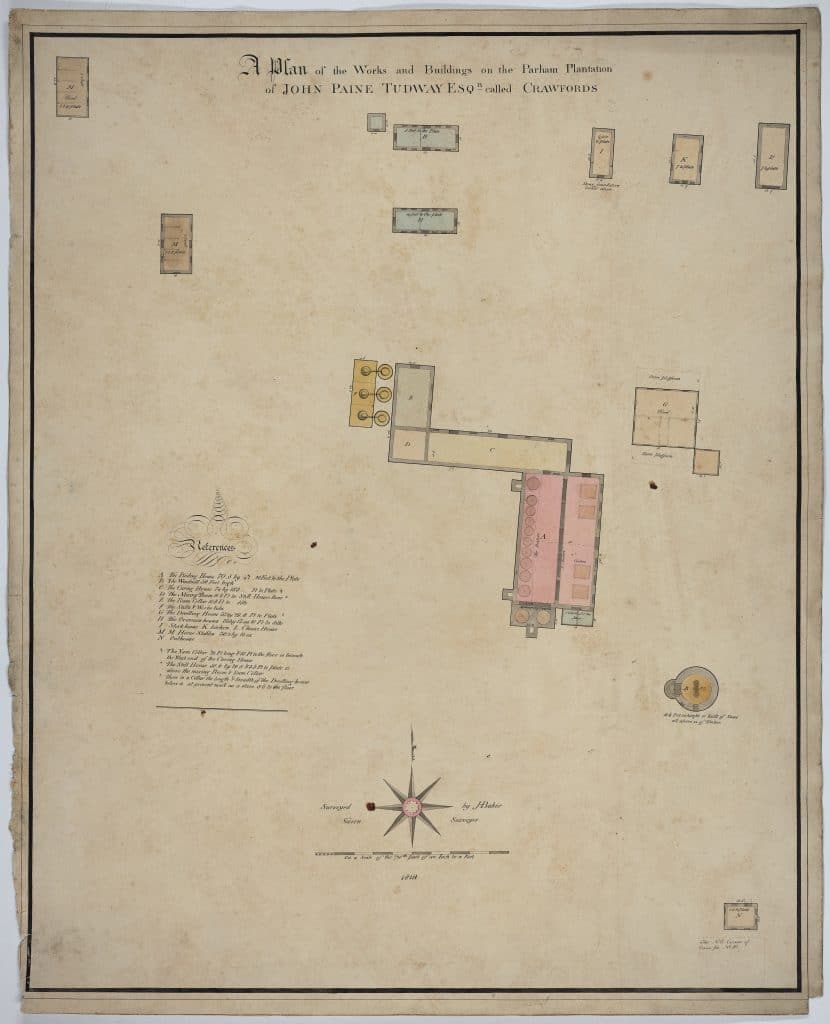 John Paine Tudway was the final tenant-for-life of the Parham plantations under slavery, although the Tudway’s ownership of the estates lasted well into the twentieth century. In the late 1810s, he commissioned a series of highly detailed surveys of the plantations and the various buildings.