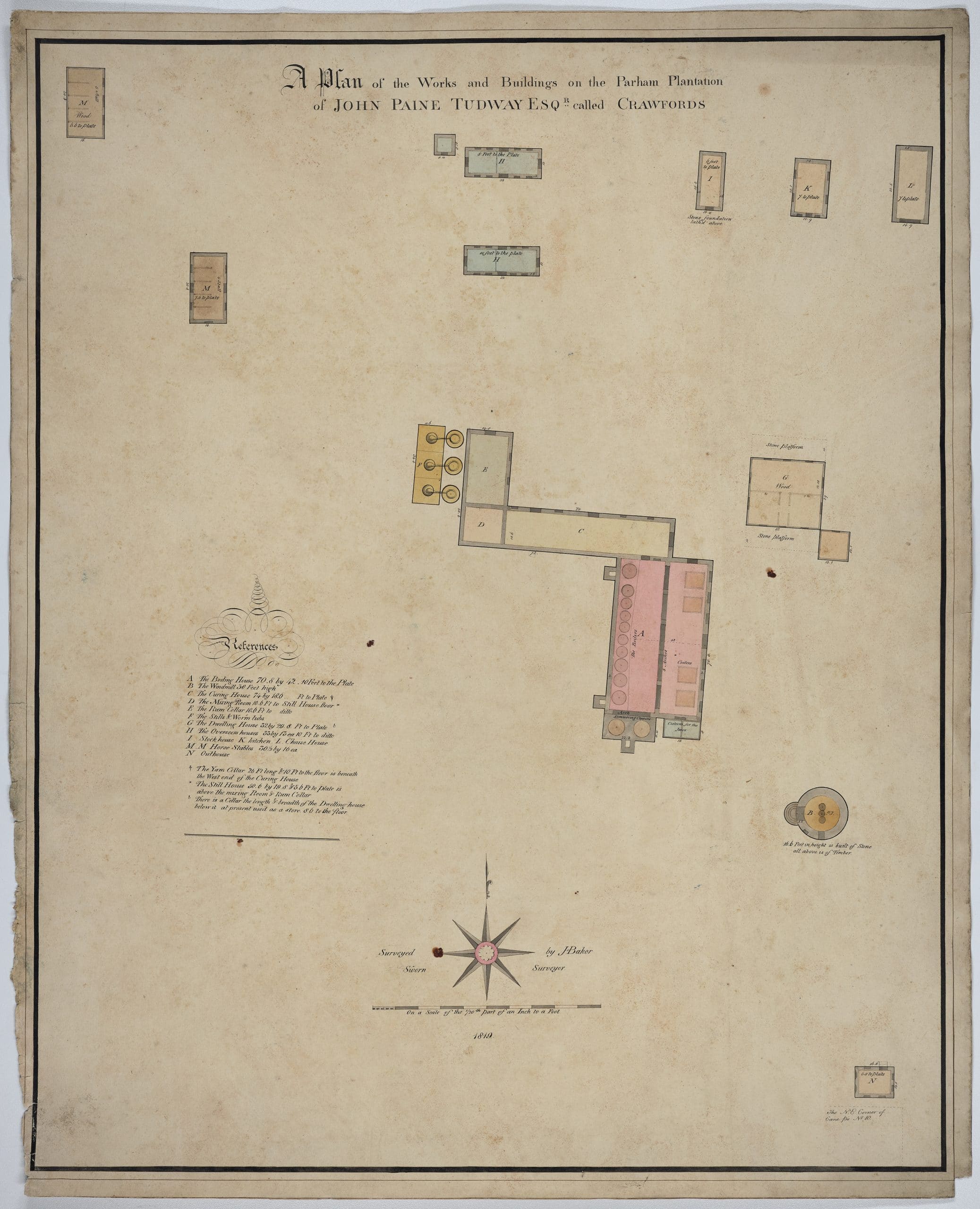 This is a later survey of the works and buildings at Crawfords by J. Baker, which formed part of the wider Parham plantation but which was being leased by Charles Crawford. It is very similar in style to the previous plans of Old Work and New Work, with the exception that this survey does not have classical embellishments. The standard features of a sugar plantation works are again present, such as a mill and boiling, curing, and distilling houses.