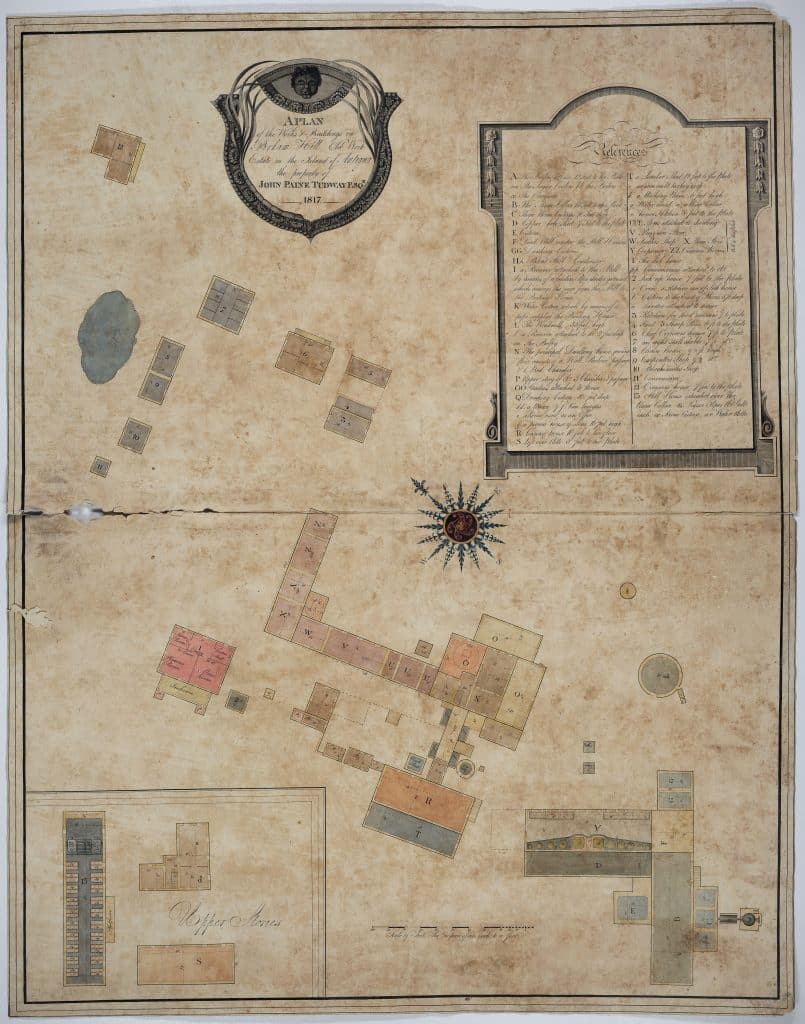 The two plans are detailed architectural drawings of the mills and various buildings at Old Work and New Work. They also make use of classical embellishments to aestheticise the surveys, intended to make the images “pleasing” to J. P. Tudway’s gaze but, for the modern viewer, renders them particularly disturbing. The New Work survey displays various cherubs unveiling the title caption, while the Old Work title features a grotesque depiction of a black man’s head. The surveyor employs colour extensively to differentiate the uses of each space in the buildings, complemented with trees and a pond on the New Work plan.
